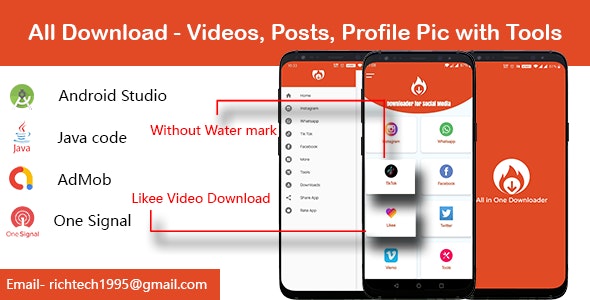 Insta,TikTok,FB,Whatsapp,Twitter Saver With editing tools – firebase| Admob | Onesignal app allow you to download.
