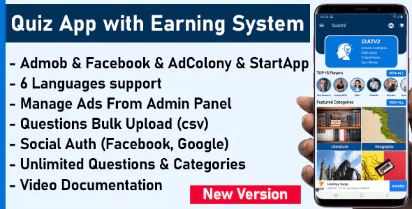 Quiz App with Earning system is an android Application that allows to users to play (answer to questions), collect rewards points & request withdrawal if they achieve the minimum withdraw amount fixed by app manager (You)! Users can also collect rewards points by inviting their friends to register to this app by referral system (referral code).