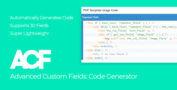 Advanced Custom Fields – Code Generator is ACF add on which automatically generates code given from fields you’ve created. It generates PHP code which is ready to be copied easily with copy to clipboard button. All you have to do is to paste it into your theme.